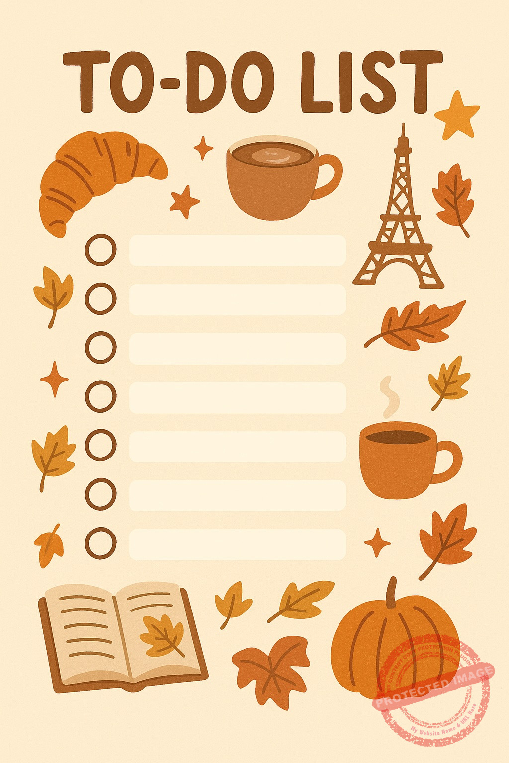 Apporte une touche parisienne et cosy à ton organisation quotidienne avec cette to-do list inspirée de l’automne et de la capitale. Entre croissant, café fumant et Tour Eiffel, elle transforme tes tâches en instants chaleureux.